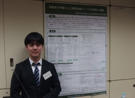 この度は、このような栄えある賞を頂きまして、大変光栄です。 専門分野は国語学で、普段は日本語の文法史の研究をしています。 普段の研究で言語資料を扱う中で、資料中のテキストをもっとデジタルに寄せて記述し、 そのデータ同士を関連付けて扱えないか、と着想したところから今回の発表に至りました。 今後は、門外漢ではありますが、文同士・形態素同士を自動で対応付けるためのアルゴリズムについて勉強を進めていき、 また、どこかで発表の機会を頂けたらと思います。 この場をお借りして、発表をお聞き下さった皆様、また、今回こうした発表の機会を与えて下さり、 懇切丁寧なご指導を頂いた永崎研宣先生にお礼申し上げます。 ありがとうございました。