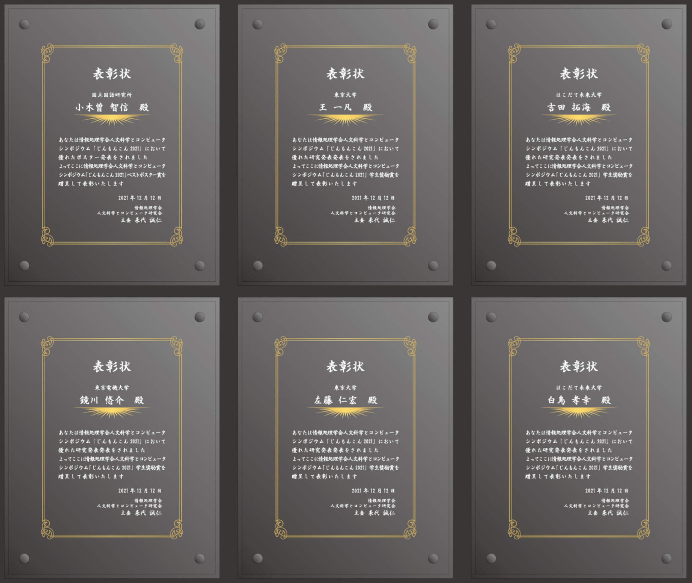 本研究会では年に1回大規模なシンポジウムを開催しています。そのシンポジウムの発表の中から、特に優れた研究をじんもんこん賞各賞として表彰しています。