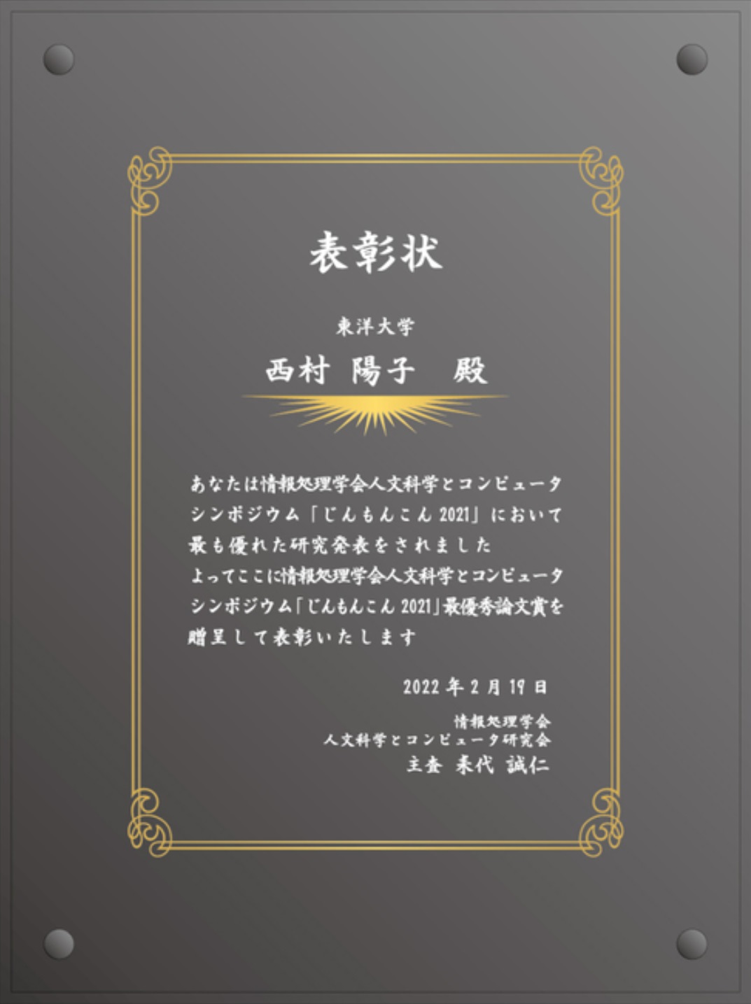 数多くの魅力的な発表がなされた「じんもんこん2023」にあって、最優秀論文賞に選んでいただき大変光栄に存じます。本研究は、歴史上の出来事や時代区分などの名称を時間を結びつけるための仕組みを提案したもので、Linked Data技術を活用することにより、研究者の多様な考え方(見解や定義の違いなど)を共存させつつ、相互に連携させるためのプラットフォームを構築したことに特徴があります。これにより、データの構築や検索、可視化や解析などのさまざまな場面で、これらの時間の名称を日付と同様に扱えるようになることが期待されます。今後、本研究の仕組みを活用した基盤データの充実などにおいて、ご助言、ご協力等いただければ幸甚に存じます。これからも、ご指導、ご鞭撻のほどよろしくお願い申し上げます。